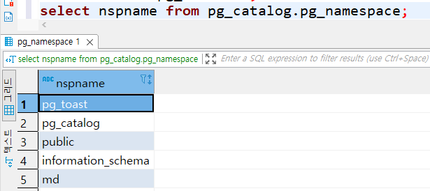 select nspname from pg_catalog.pg_namespace; -- 전체 스키마 목록 조회